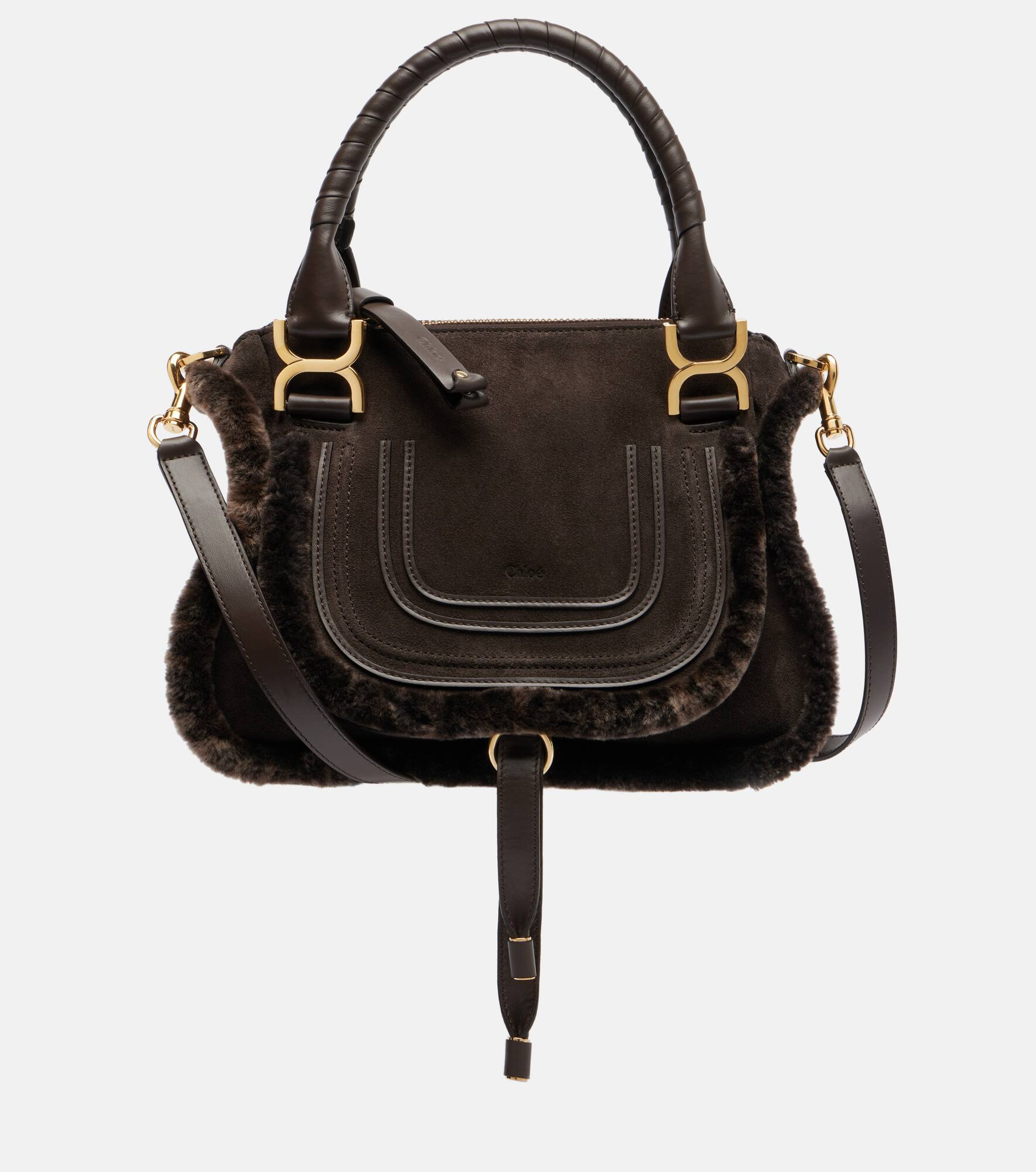 Chloe's Marcie Small tote bag is known for its horseshoe-style curved front panel, tonal saddle stitches, and tassels. Finished with hand-wrapped top handles and a detachable long strap, this accessory is made from suede with shearling trims. Product Details - Material: calf leather (suede) - Lining: suede - Made in Italy - Designer color name: Kohl Brown - Item color: brown - Trim: shearling - Hardware color: gold - Closure: zipped top - Internal details: internal zipped pocket - Top handles, Detachable shoulder strap - Includes: dust bag - Item number: P01085893 Size & Fit - Height 23cm-9" - Width 30cm-12" - Depth 7cm-3" - Length of handles 41.5cm-16.5" - Length shoulder strap 104cm-41"