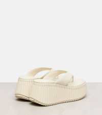 The Nama thong sandals by Chloe blend minimalism with distinctive detailing. Crafted from leather, this pair features a debossed logo on the upper and stands out with chunky 80mm platforms, finished with hand-stitched accents. Product Details - Upper: leather - Lining: leather - Sole: leather insole, rubber sole - Toe shape: round open toe - Made in Vietnam - Includes: dust bag, shoe box - Designer color name: Eggshell - Item color: white - Item number: P01041518 Size & Fit - True to size - European sizes - 6cm-2.5" platform (size EU 38) - 8cm-3" wedge heel (size EU 38)