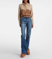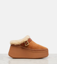 The Nama platform mules by Chloe blend minimalism with distinctive detailing. Crafted from suede with a shearling lining, this pair features adjustable buckle straps on the uppers, 80mm platform heels, and hand-stitched accents. Product Details - Upper: calf leather (suede) - Lining: shearling - Sole: shearling insole, rubber sole - Toe shape: round toe - Made in Vietnam - Includes: shoe box, dust bag - Designer color name: Pottery Brown - Item color: brown - Hardware color: gold - Closure: buckle fastening - Item number: P01102200 Size & Fit - True to size - European sizes - 8cm-3" heel (size EU 38) - 4,5cm-2" platform (size EU 38)