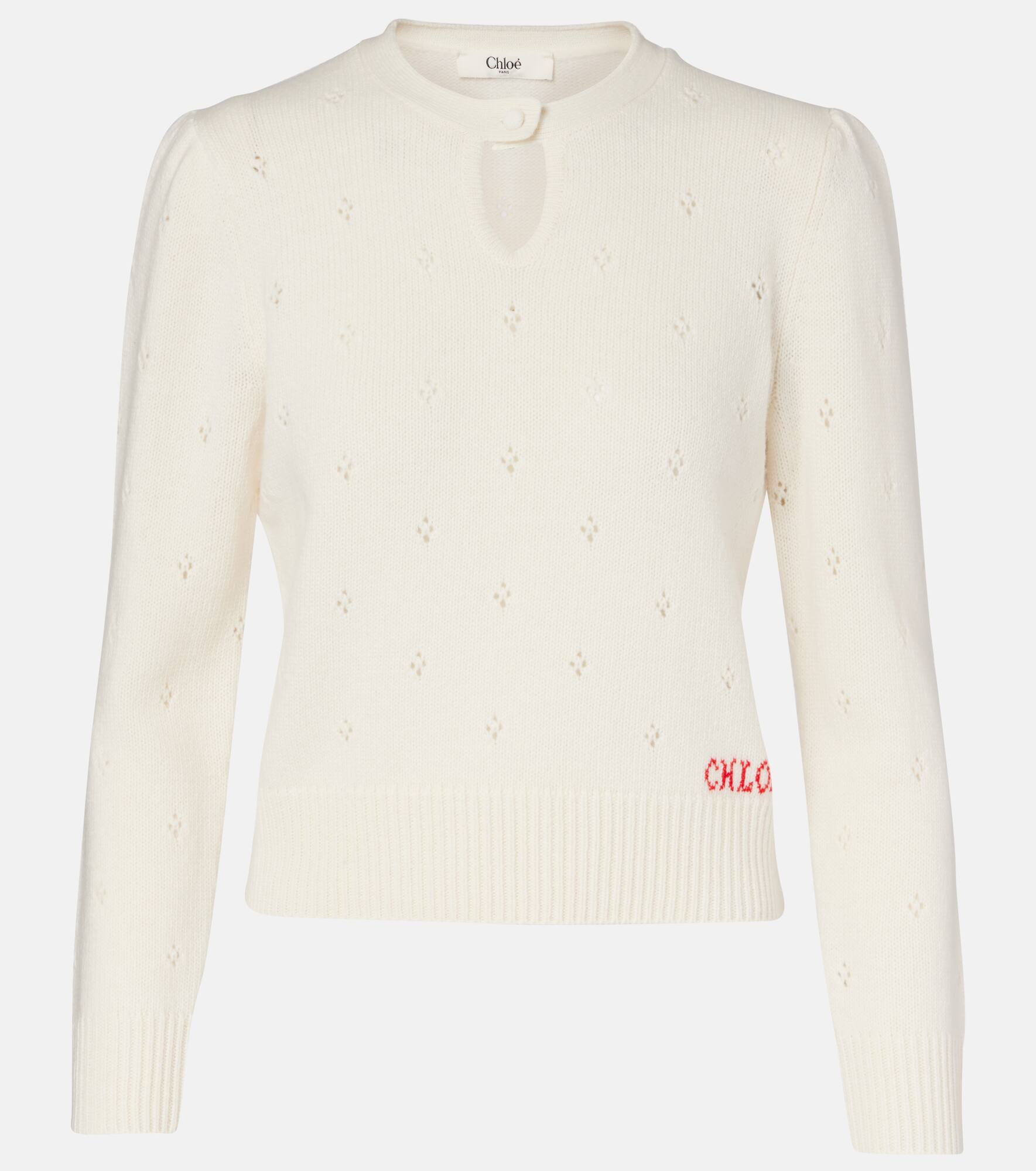 Complete your wardrobe with charming essentials like this Chloe sweater. Crafted from wool and cashmere, the design features a front keyhole cutout, delicate pointelle detailing, and a contrasting logo on the ribbed hemline. Product Details - Material: 71% wool, 29% cashmere - Care instructions: dry clean - Made in China - Designer color name: Iconic Milk - Item color: white - Cuff: ribbed - Hem: ribbed - Item number: P01090105 Size & Fit - True to size - Straight fit - Slightly cropped - The model seen in the picture is 178cm-5'10" and wearing a size XS