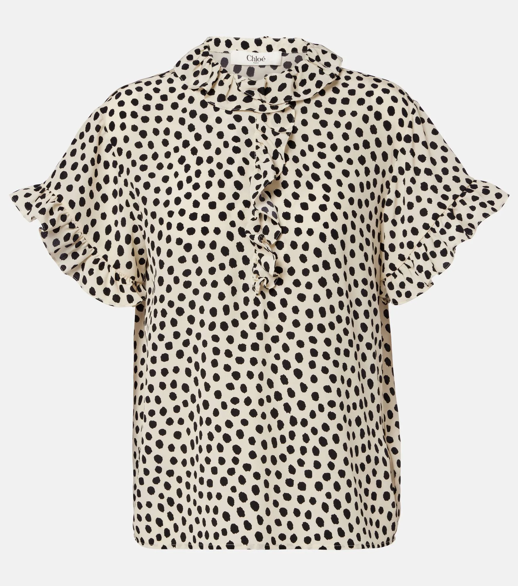Renowned for its free-spirited aesthetic, Chloe's designs are characterized by romance with a Parisian flair. This top is Italian-crafted from luxurious, polka-dotted silk crepe de chine with elegant ruffles at the neckline and sleeves. Product Details - Material: 100% silk - Care instructions: dry clean - Made in Italy - Color: white - Designer color name: Beige - Black 1 - Contains non-textile parts of animal origin - Item number: P01130697 Size & Fit - True to size - Dropped shoulders - Designed for a loose fit - Non-stretchy fabric - Falls below the hip - The model seen in the picture is 178cm-5'10" and wearing a size FR 36