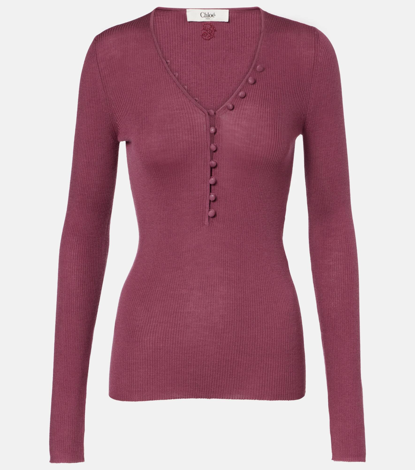 Renowned for its free-spirited aesthetic, Chloe's designs are characterized by romance with a Parisian flair. This long-sleeved top is ribbed-knit from pure wool and features a V-neckline trimmed with tonal buttons. Product Details - Material: 100% wool - Care instructions: dry clean - Made in China - Designer color name: Rusty Pink - Item color: pink - Closure: partially buttoned front - Item number: P01089598 Size & Fit - True to size - Fitted - Stretchy fabric - Falls below the hip - The model seen in the picture is 178cm-5'10" and wearing a size XS