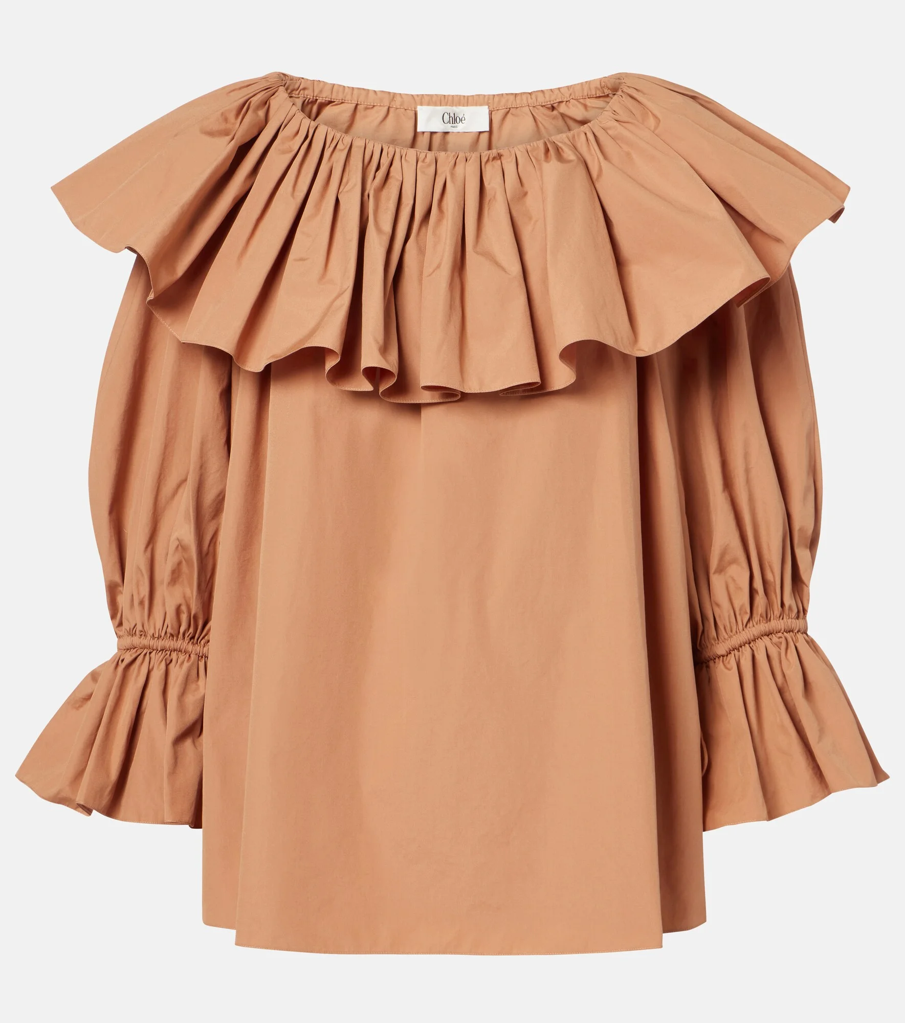 Chloe's designs are characterized by romance with a Parisian flair. Made from breezy cotton poplin, this billowy blouse comes with voluminous gathered sleeves and a ruffled neckline. Product Details - Material: 100% cotton - Care instructions: dry clean - Made in Slovakia - Color: brown - Designer color name: Reef Shell - Collar: ruffled - Cuff: elasticated - Item number: P01152818 Size & Fit - True to size - Designed for a loose fit - Non-stretchy fabric - Falls below the hip - The model seen in the picture is 178cm-5'10" and wearing a size FR 36