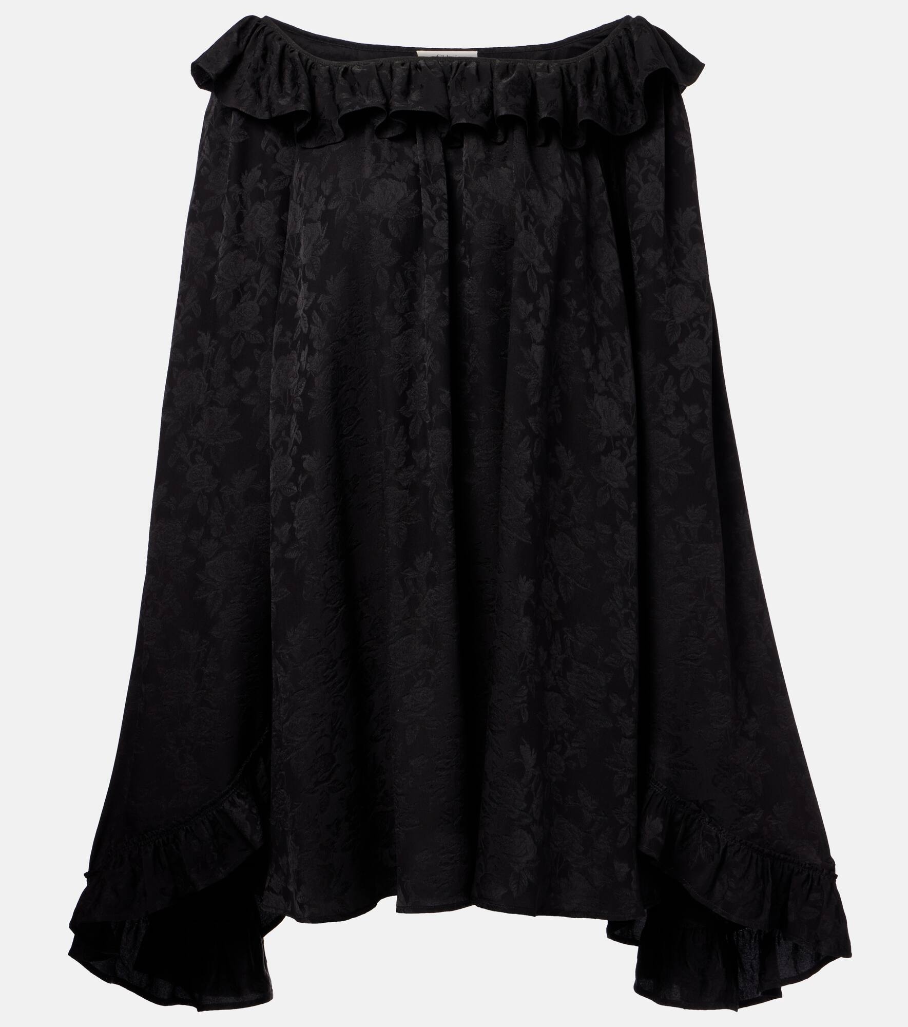 Crafted from lightweight silk, this minidress from Chloe features an elegant all-over jacquard design. The relaxed fit silhouette features elongated sleeves, ruffles at the hems, and a flattering open neckline. Product Details - Material: 100% silk - Care instructions: dry clean - Made in Madagascar - Designer color name: Black - Item color: black - Item number: P01049060 Size & Fit - True to size - Extra-long sleeves - Designed for a loose fit - Non-stretchy fabric - The model seen in the picture is 178cm-5'10" and wearing a size FR 36
