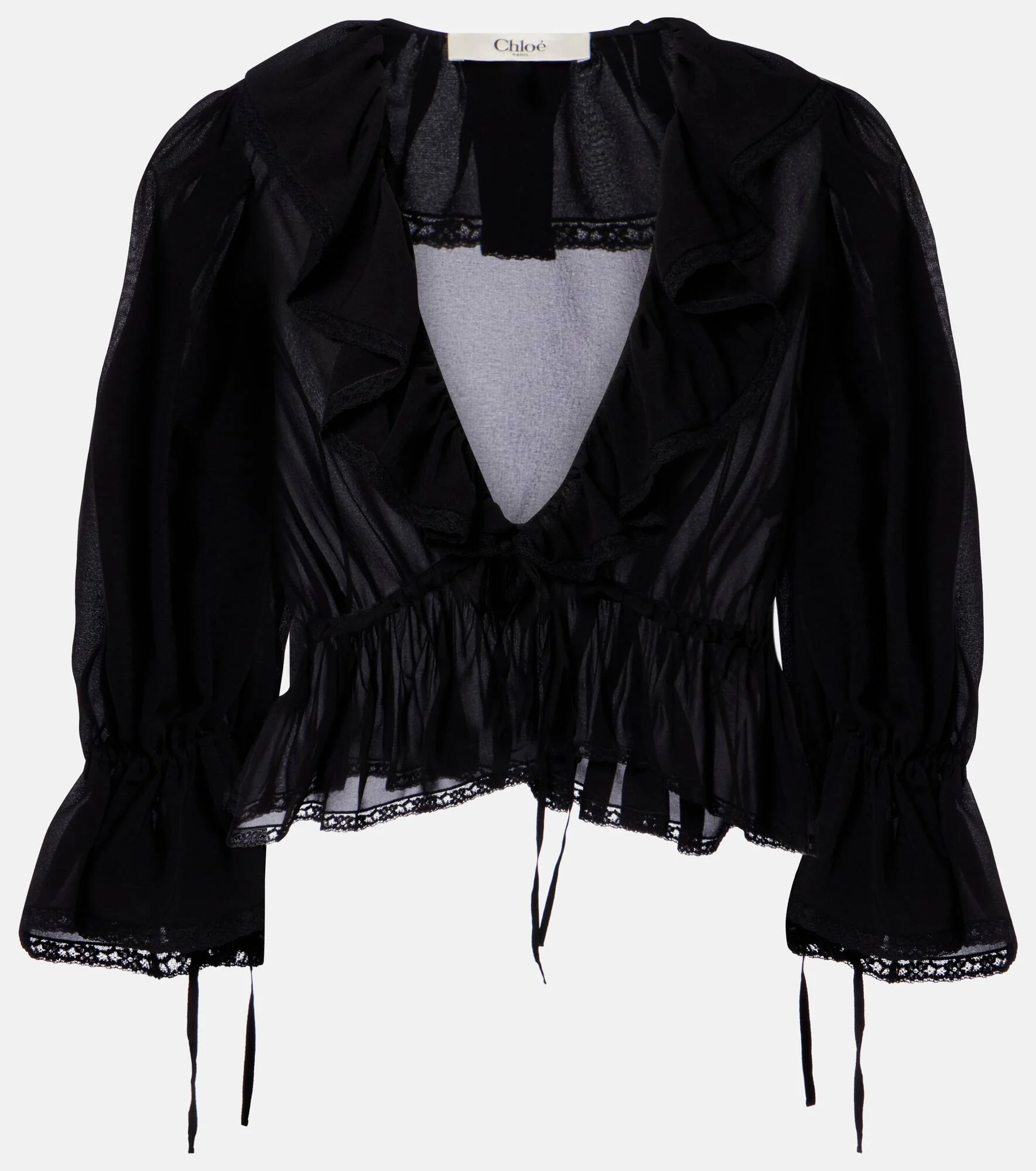 Renowned for its free-spirited aesthetic, Chloe's designs are characterized by romance with a Parisian flair. Italian-made from pure, lightweight silk, this gorgeous blouse is detailed with ruffled trims, lace inserts, and self-ties at the cuffs and waist. Product Details - Material: 100% silk - Care instructions: dry clean - Made in Slovakia - Color: black - Designer color name: Black - Trim: 95% cotton, 5% polyamide - Contains non-textile parts of animal origin - Drawstring cuffs - Drawstring waist - Item number: P01152823 Size & Fit - True to size - Designed for a loose fit - Adjustable at the waist - Non-stretchy fabric - Slightly cropped - The model seen in the picture is 178cm-5'10" and wearing a size FR 36