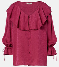 Chloe's designs are characterized by romance with a Parisian flair. Made from exquisite silk jacquard, this blouse is characterized by drawstring cuffs and charming ruffles at the collar. Product Details - Material: 100% silk - Care instructions: dry clean - Made in Italy - Color: burgundy - Designer color name: Dark Ruby - Contains non-textile parts of animal origin - Closure: buttoned front - Cuff: ruffled - Drawstring cuffs - Item number: P01152825 Size & Fit - True to size - Dropped shoulders - Designed for a loose fit - Non-stretchy fabric - Falls below the hip - The model seen in the picture is 178cm-5'10" and wearing a size FR 36