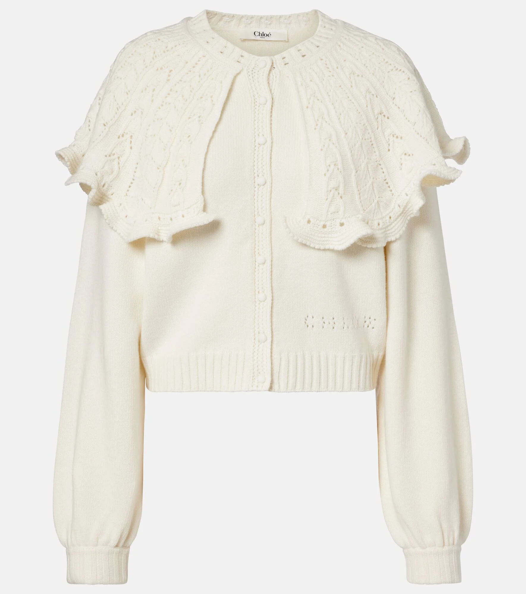 Renowned for its free-spirited aesthetic, Chloe's designs are characterized by romance with a Parisian flair. This cardigan is knitted from soft wool and cashmere and boasts elegant ruffle details. Product Details - Material: 71% wool, 29% cashmere - Care instructions: dry clean - Made in China - Color: beige - Designer color name: Iconic Milk - Closure: buttoned front - Cuff: ribbed - Hem: ribbed - Item number: P01130740 Size & Fit - True to size - Dropped shoulders - Straight fit - Slightly stretchy fabric - Falls to the hip - The model seen in the picture is 178cm-5'10" and wearing a size XS