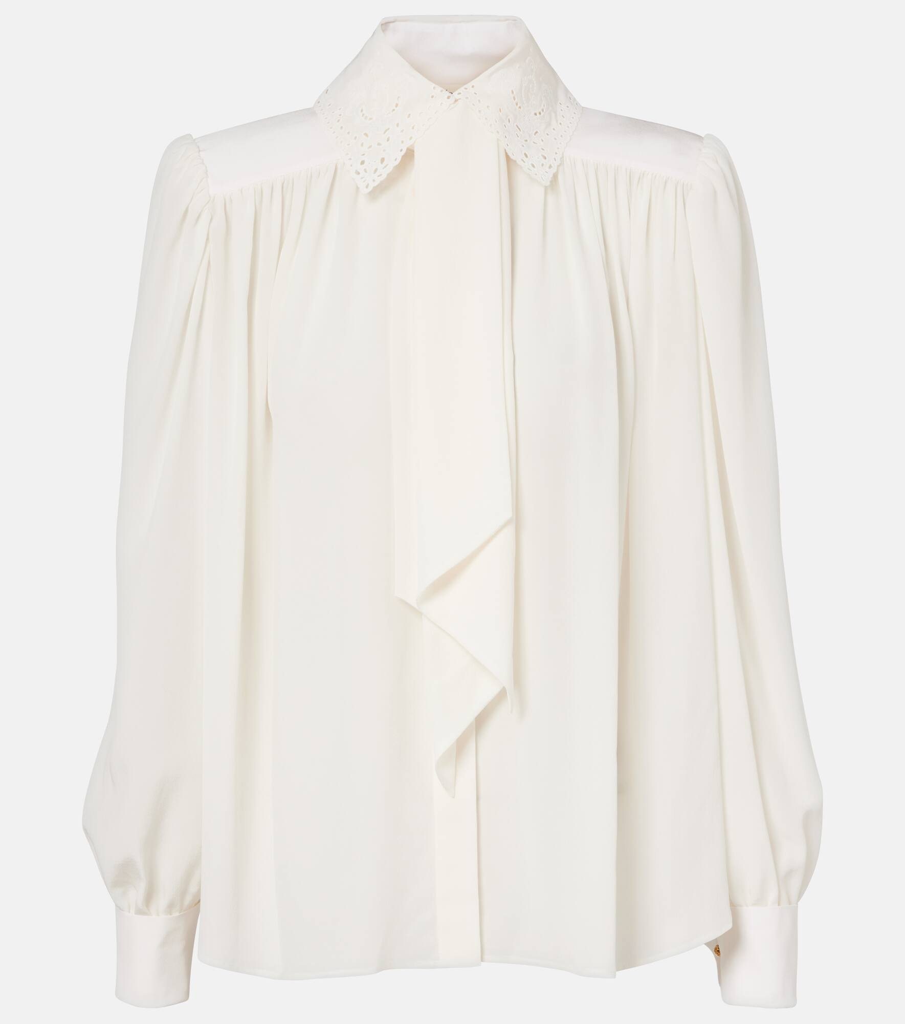 Renowned for its free-spirited aesthetic, Chloe's designs are characterized by romance with a Parisian flair. Crafted from silk crepe de chine, this blouse features a charming lace-trimmed collar and a detachable scarf. Product Details - Material: 100% silk - Care instructions: dry clean - Made in Slovakia - Designer color name: Iconic Milk - Item color: white - Details: 76% acetate, 24% silk - Trim: 100% mother-of-pearl - Contains non-textile parts of animal origin - Closure: buttoned placket - Item number: P01089546 Size & Fit - True to size - Shoulder pad inserts - Semi-sheer - Designed for a loose fit - Non-stretchy fabric - Falls below the hip - The model seen in the picture is 178cm-5'10" and wearing a size FR 36