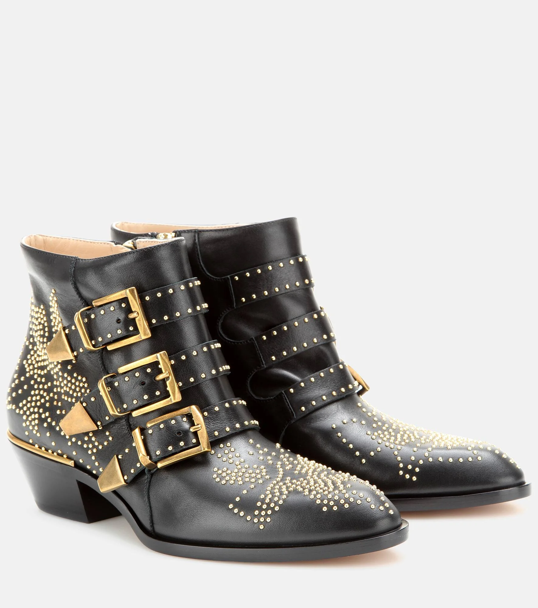Embrace studs the Chloé way with an air of effortless esprit. Smooth black leather contrasts harmoniously with high-shine gold studding, making the 'Susanna' ankle boots a must-have now and forever. Product Details - Lining: leather - Closure: buckle fastening, zipped side - Toe shape: round toe - Sole: leather insole and sole - Upper: lamb leather - Made in Italy - Item number: P00274101 Size & Fit - Fits large to size - we recommend trying one size smaller - European sizes - 4,5cm-2" heel (size EU 38)