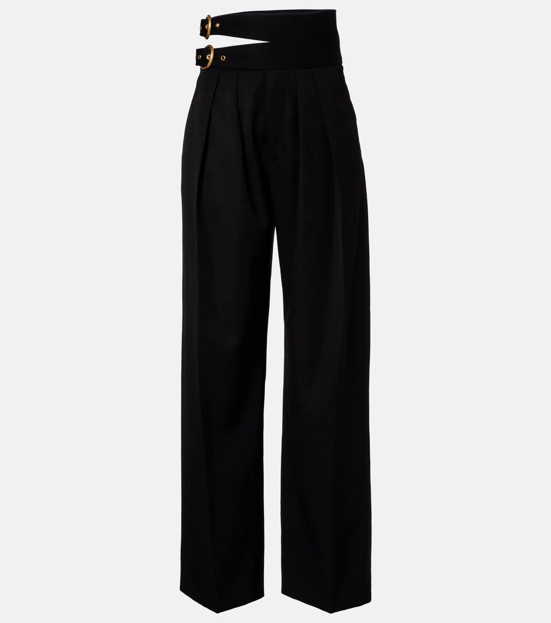 Renowned for its free-spirited aesthetic, Chloe's designs are characterized by romance with a Parisian flair. These wide-leg pants are expertly crafted from virgin wool grain de poudre with crisp pleats and a buckled cutout waist. Product Details - Material: 100% virgin wool - Care instructions: dry clean - Made in Slovakia - Color: black - Designer color name: Black - Item color: black - Pocket lining: 100% cotton - Details: 100% water-buffalo horn - Contains non-textile parts of animal origin - Closure: zipper fly, button and hook fastenings - Pockets: side slit pockets - Item number: P01130728 Size & Fit - True to size - Adjustable at the waist - Non-stretchy fabric - Wide-leg - High-waisted - The model seen in the picture is 178cm-5'10" and wearing a size FR 36