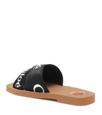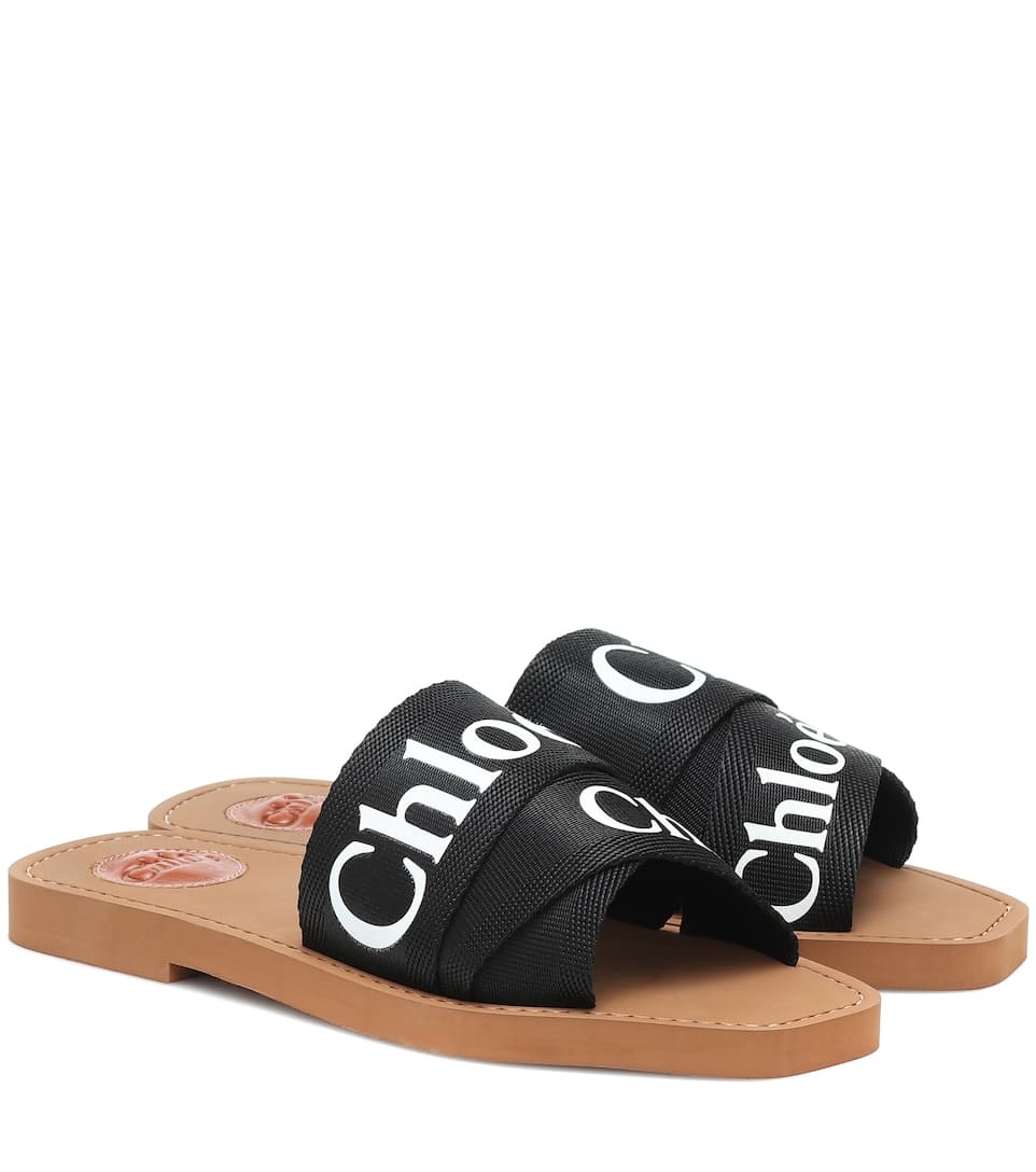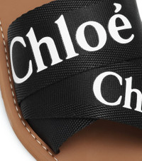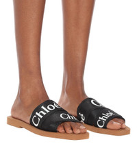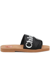 Chloé offers a summer essential with the Woody slides, which possesses a black cotton canvas upper and brown rubber sole. Crafted in Italy, this slip-on style is elevated by the label's striking logo print in high-contrast white. Show yours off with cropped denim and midi skirts alike. Product Details - Upper: fabric - Sole: fabric insole, rubber sole - Comes with dust bags, Comes with a box - Toe shape: square open toe - Lining: fabric - Designer color name: Black - Made in Italy - Item number: P00433728 Size & Fit - True to size - Narrow at the toe - European sizes - 2,0cm-1" heel (size EU 38) - 1,5cm-0.5" platform (size EU 38)