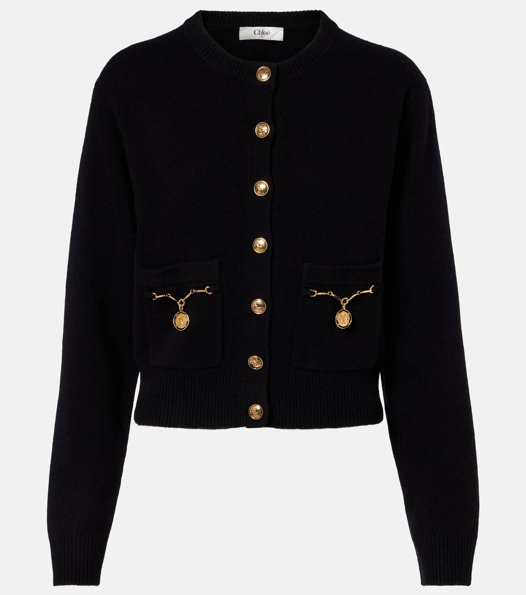 Renowned for its free-spirited aesthetic, Chloe's designs are characterized by romance with a Parisian flair. This cardigan is knitted from soft wool and cashmere and boasts statement gold-toned buttons and hardware at the pockets. Product Details - Material: 92% wool, 8% cashmere - Care instructions: dry clean - Made in China - Color: black - Designer color name: Black - Hardware color: gold - Closure: buttoned front - Cuff: ribbed - Hem: ribbed - Item number: P01130742 Size & Fit - True to size - Straight fit - Stretchy fabric - Slightly cropped - The model seen in the picture is 178cm-5'10" and wearing a size XS