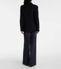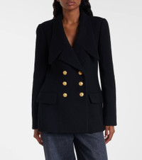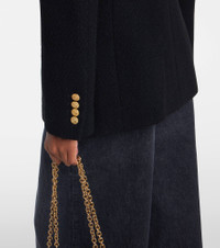 Crafted from soft wool-blend boucle, this Chloe jacket is tailored to a flattering silhouette with structured, padded shoulders. The double-breasted design is finished with gold-toned buttons, adding a polished, refined touch. Product Details - Material: 89% wool, 10% polyamide, 1% elastane - Care instructions: dry clean - Made in Slovakia - Designer color name: Black - Item color: black - Lining: 100% silk - Details: 100% water-buffalo horn - Contains non-textile parts of animal origin - Blazer - Closure: double-breasted (six buttons) - Pockets: flap pockets - Cuff: four buttons - Vent: no vent - Hardware color: gold - Item number: P01067908 Size & Fit - Fits large to size - we recommend trying one size smaller - Shoulder pad inserts - Cinched waist - Non-stretchy fabric - Falls below the hip - The model seen in the picture is 178cm-5'10" and wearing a size FR 34