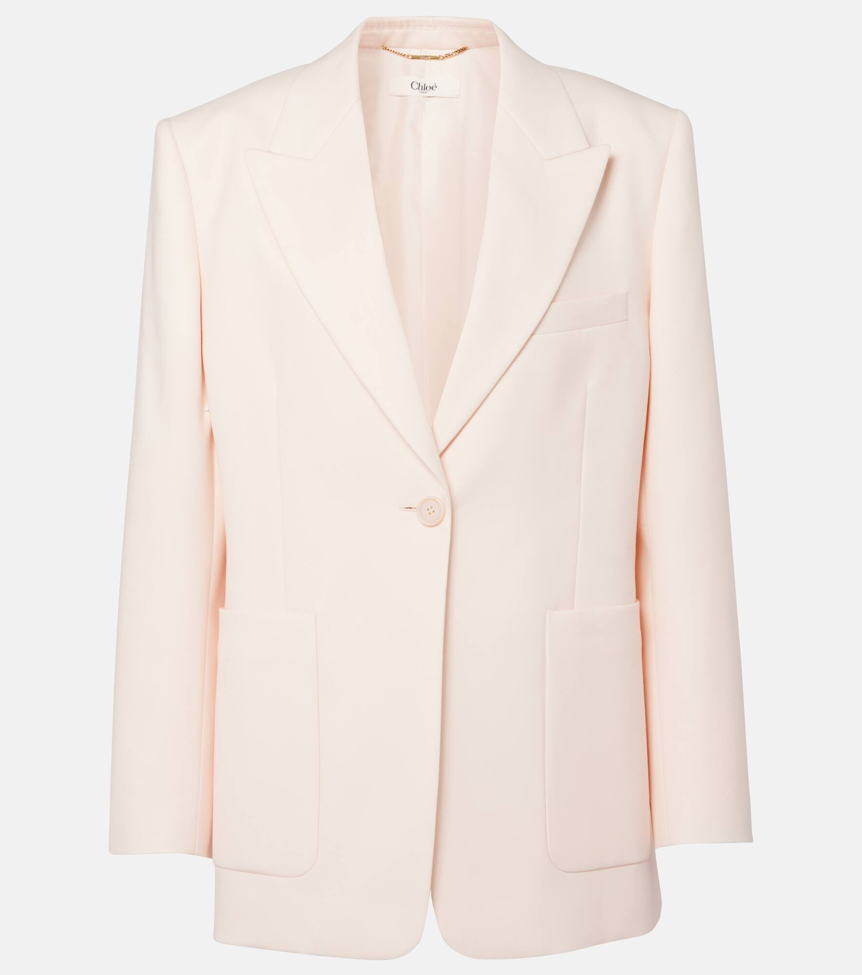 Renowned for its free-spirited aesthetic, Chloe's designs are characterized by romance with a Parisian flair. This suit jacket is made from wool gabardine in a single-breasted silhouette. Product Details - Material: 100% wool - Care instructions: dry clean - Made in Italy - Designer color name: Biscuit Pink - Item color: pink - Lining: 100% silk - Contains non-textile parts of animal origin - Pockets: patch pockets, breast pocket, internal pockets - Peak lapel - Closure: single-breasted (one button) - Cuff: four buttons - Item number: P01067916 Size & Fit - True to size - Shoulder pad inserts - Straight fit - Non-stretchy fabric - Falls below the hip - The model seen in the picture is 178cm-5'10" and wearing a size FR 36