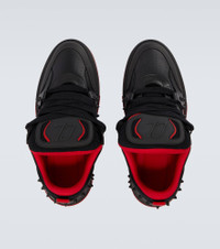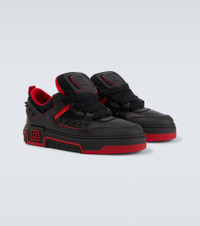 The wide-set silhouette of the Astroskate sneakers is accented by leather trims, exaggerated tongues, and tonal spike embellishments. Finished with Christian Louboutin's iconic red soles, this pair makes every step you take a sophisticated one. Product Details - Upper: calf leather - Lining: fabric - Sole: fabric insole, signature red rubber sole - Toe shape: round toe - Made in Italy - Includes: shoe box, dust bag - Designer color name: Black/Loubi - Item color: black, red - Closure: lace-up - Item number: P01067689 Size & Fit - True to size - European sizes