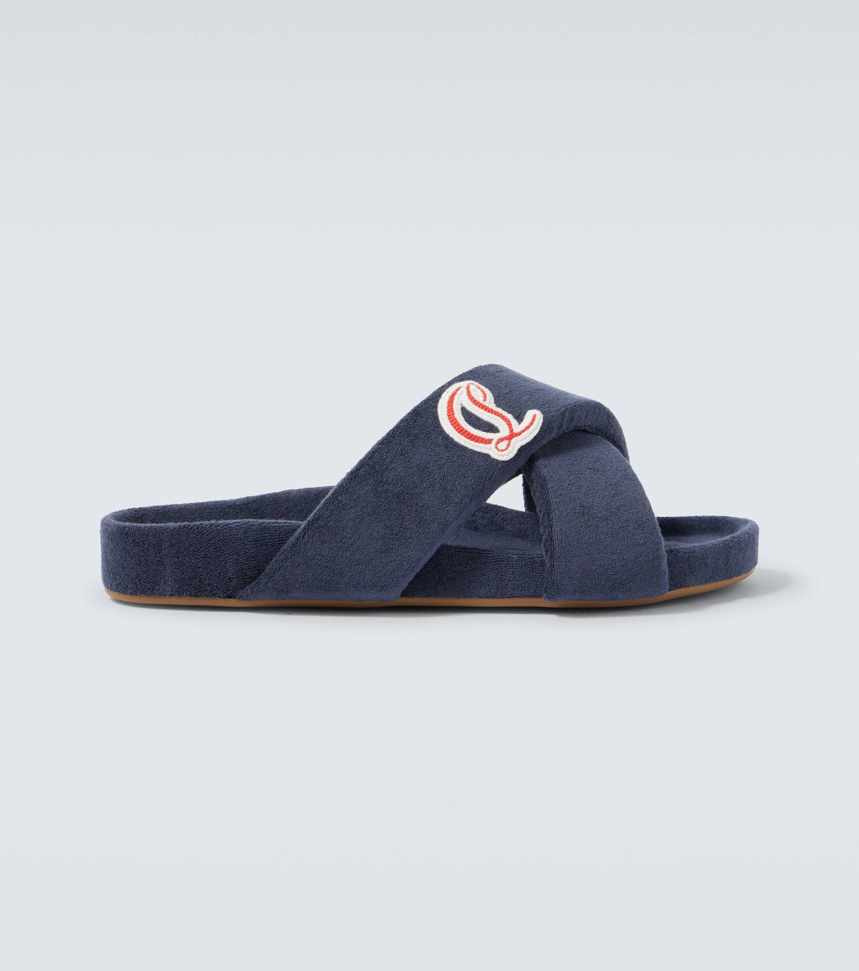 The Bizzu slides have a round toe and are finished with a contrasting logo embroidery. Finished with Christian Louboutin's iconic red soles, this pair makes every step you take a sophisticated one. Product Details - Upper: fabric - Lining: fabric, leather - Sole: fabric insole, signature red rubber sole - Toe shape: round toe - Made in Spain - Includes: dust bag, shoe box - Designer color name: Marine - Item color: blue - Item number: P01050855 Size & Fit - Fits slightly large to size - we recommend trying a half size smaller - European sizes