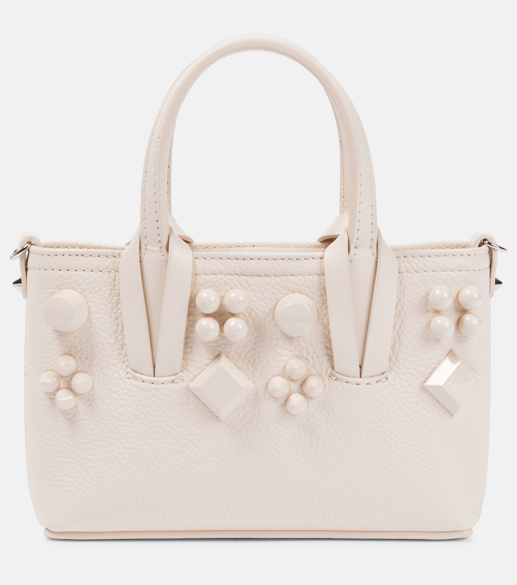 Christian Louboutin’s Cabata E/W Nano makes a big statement despite its small size. Made in Italy from calf leather, this design makes a textural statement with its monochromatic spikes arranged in the signature Loubinthesky pattern. Product Details - Made in Spain - Comes with dust bag, Comes with a box - Designer color name: Leche/Leche - Color of fastening: silver - Closure: snap-clasp fastening - Internal details: leather lining - Detachable, adjustable shoulder strap, Top handles - Material: leather - Item number: P00753272 Size & Fit - Height 12cm-4.5" - Width 19cm-7.5" - Depth 4cm-1.5" - Min. length shoulder strap 93cm-36.5" - Max. length shoulder strap 104cm-41"