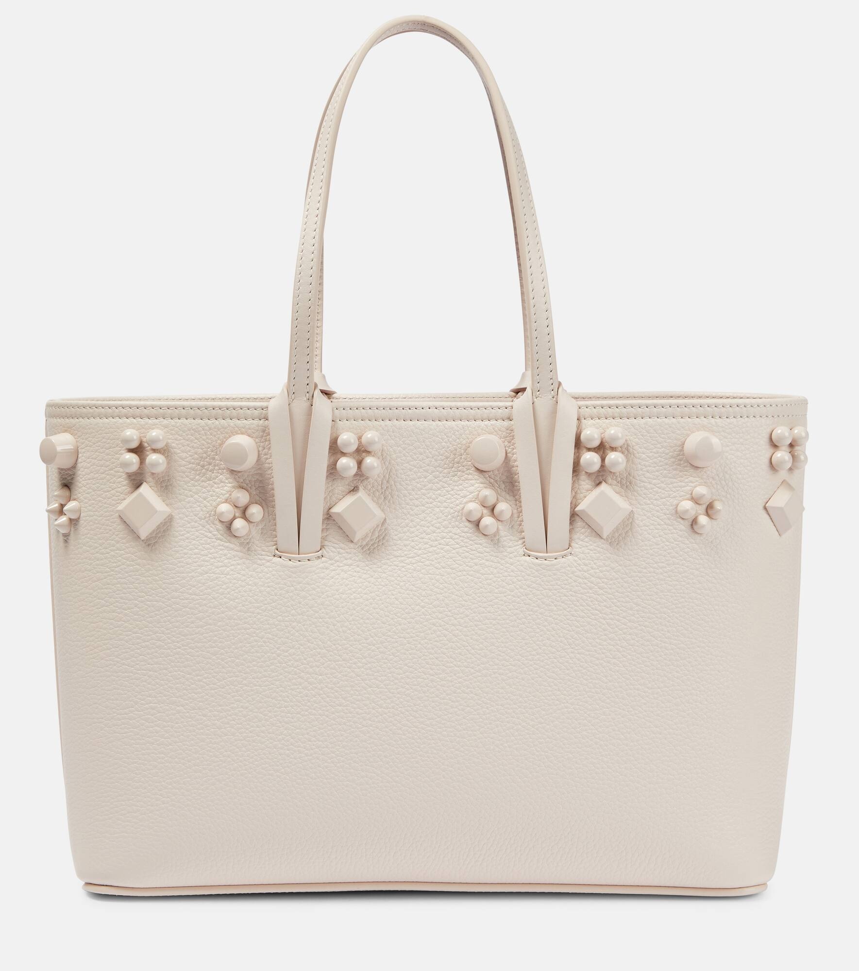 Christian Louboutin reworks the iconic Cabata tote, adorning it with oversized tonal studs set in a regal motif. This Small design is made in Italy from grained beige leather and features the label's signature lipstick-red accents. Product Details - Made in Italy - Internal details: internal zipped pouch, leather lining - Designer color name: Leche/Leche - Top handles - Color of fastening: silver - Material: calf leather - Protective leather bottom - Item number: P00753270 Size & Fit - Height 24cm-9.5" - Width 34cm-13.5" - Depth 11,5cm-4.5" - Length of handles 44cm-17.5" - Clutch height 17cm-6.5" - Clutch width 22,5cm-9"