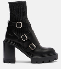 Achieve the layered look without the bulk with Cortinetta College ankle boots from Prada. Made in Italy, the pair has buckled leather uppers, knitted sock trims, and 100mm block heels accented by the brand's signature red soles. Product Details - Upper: fabric, leather - Lining: fabric, leather - Sole: leather insole, signature red rubber sole - Toe shape: round toe - Made in Italy - Includes: shoe box, dust bag - Designer color name: Version Black - Item color: black - Hardware color: silver - Closure: buckle fastening - Item number: P01082511 Size & Fit - True to size - European sizes - 10cm-4" heel (size EU 38) - 4cm-1.5" platform (size EU 38)