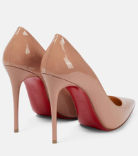 One of Christian Louboutin's most iconic creations, the Kate pumps are designed to enhance the foot's sensual arch. They come in a sleek pointed-toe silhouette that balances on a pin-thin 100mm stiletto heel for a seriously seductive portrait. The glossy beige upper is crafted from patent leather, while the label's signature red soles promise to complete any look with scene-stealing power. Product Details - Lining: leather - Upper: calf leather - Sole: leather insole, signature red leather sole - Toe shape: pointed toe - Made in Italy - Designer color name: Nude - Item number: P00402698 Size & Fit - Fits slightly large to size - we recommend trying a half size smaller - Narrow at the toe - European sizes - 10cm-4" heel (size EU 38)
