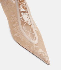 The KM ankle boots from Christian Louboutin are crafted in Italy from leather with delicate floral lace trims. This pair sits atop 100mm stiletto heels and features a sharp pointed toe and a lace-up closure. Product Details - Upper: fabric, leather - Lining: fabric, leather - Sole: leather insole, signatured red leather and rubber sole - Toe shape: pointed toe - Made in Italy - Includes: dust bag, shoe box - Designer color name: Pearl - Item color: pink - Trim: lamb leather - Closure: zipped back, lace-up - Item number: P01082523 Size & Fit - True to size - Slightly narrow at the toe - European sizes - 10cm-4" heel (size EU 38)