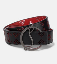 Christian Louboutin's impeccable attention to detail shines through with this black belt. Made in Italy from smooth calf leather, it's laser cut with the label logo alongside a series of geometric shapes, and fastens via a gunmetal-grey monogram buckle. - material: calf leather - Made in Italy - Designer colour name: Black/Loubi/Gun Metal - buckle fastening - comes with a box - comes with a dust bag