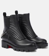 Combat books like this Maddic Max pair from Christian Louboutin are nothing short of essential. This pair's uppers are made from smooth black leather with ridged, padded vamps for support, and the lugged soles are tinted in label-signature lipstick red. Positively gleaming chainlink harnesses ensure this ankle-height pair will not go unnoticed. - upper: calf leather - lining: leather - trim: brass - sole: leather insole, signature red leather sole - round toe - zipped side - Made in Italy - Designer colour name: Black