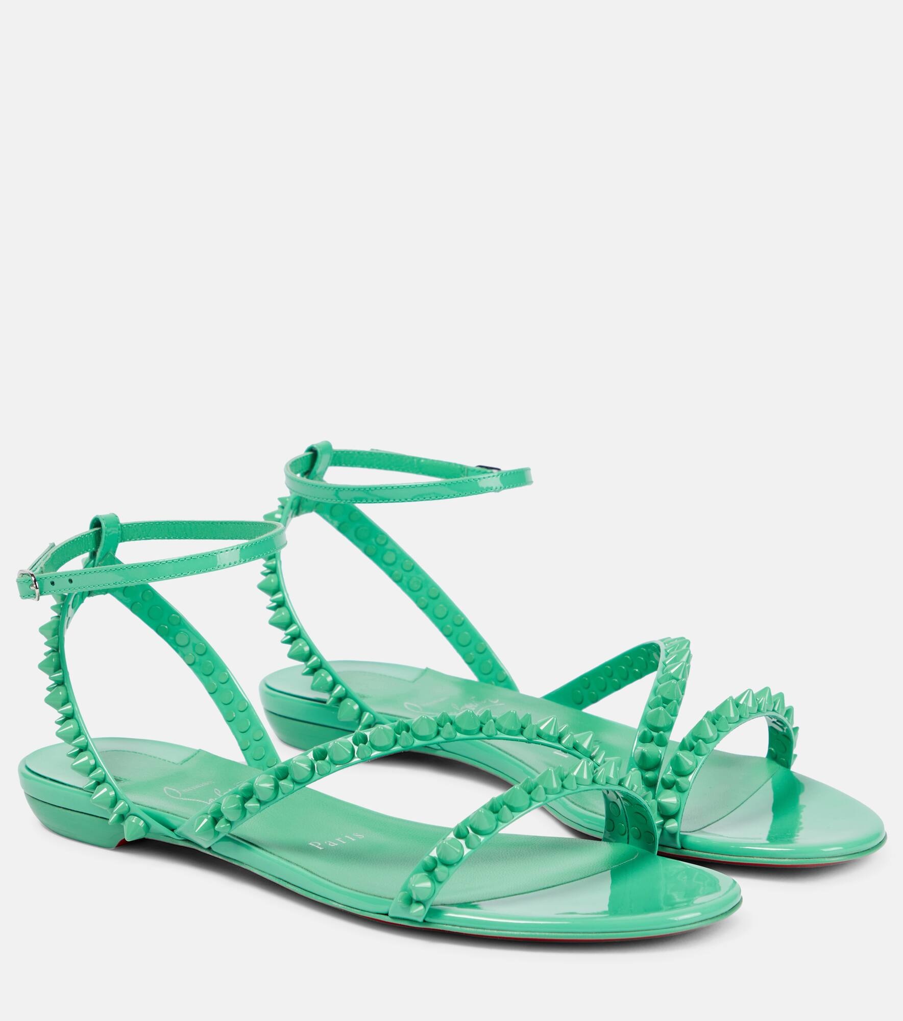 The Mafaldina Spikes sandals from Christian Louboutin x Mytheresa’s Exclusive Summer Capsule are embellished with tonal Lou spikes for iconic recognition. They’re made from pastel green patent leather with slightly stacked heels for all-day comfort. Product Details - Toe shape: round open toe - Closure: buckle-fastening ankle strap - Sole: leather insole and sole - Lining: calf leather - Made in Italy - Comes with dust bags - Designer color name: Detox - exclusive to mytheresa.com - Trim: calf leather - Upper: calf leather - Comes with a box - Item number: P00691739 Size & Fit - True to size - Slightly wide - European sizes - 1,5cm-0.5" heel (size EU 38)
