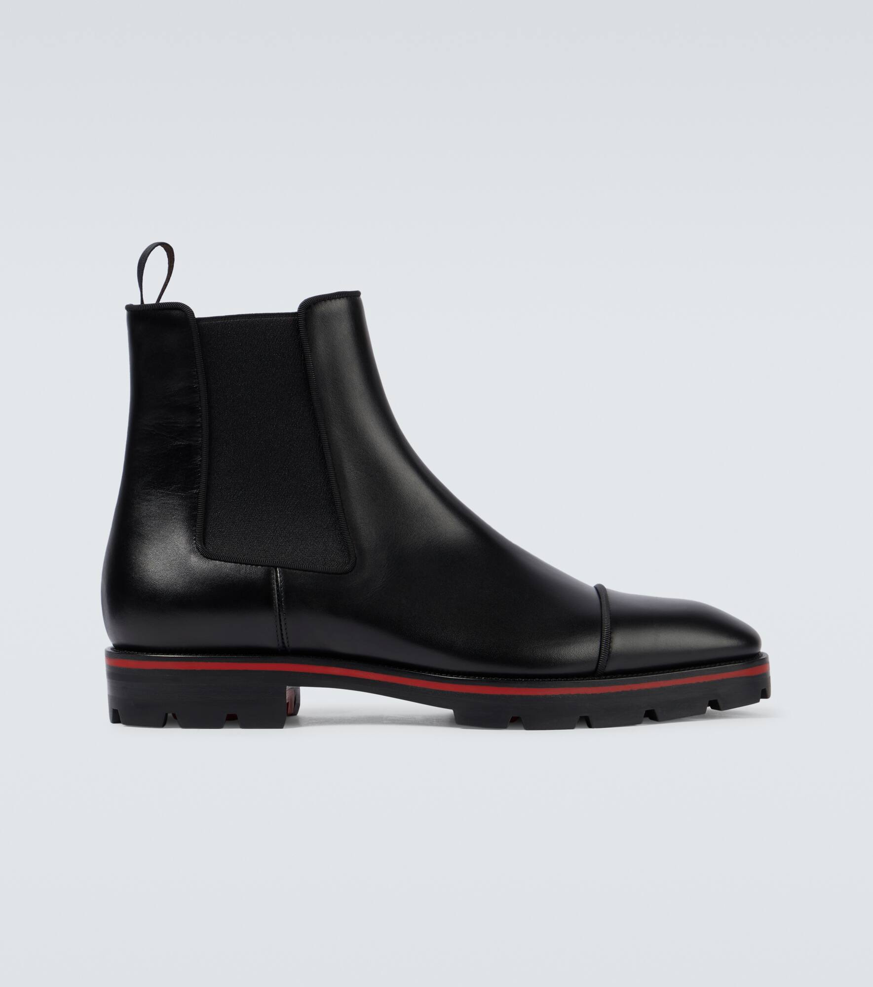 The Melon Chelsea boots from Christian Louboutin are crafted from black leather in a almond-toe silhouette, and feature thick soles and welts for frequent wear. A flash of signature Maison Louboutin red outlines the sole. Product Details - Lining: leather, fabric - Upper: fabric, leather - Sole: leather insole, rubber sole - Toe shape: round toe - Made in Italy - Designer color name: Black - Closure: elasticated sides - Item number: P00632382 Size & Fit - True to size - Slightly narrow - Half sizes please take the next size up - European sizes