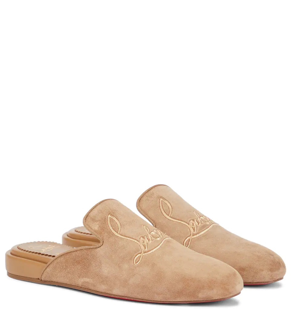 From Christian Louboutin's exclusive Nudes range, the Navy Coolito Donna slippers come in a spectrum of shades. Designed for Mytheresa, this pair in medium beige – the third hue of the collection – is made from soft suede with lambskin leather linings and logo-embroidered vamps. Product Details - exclusive to mytheresa.com - Lining: leather - Toe shape: round toe - Upper: calf leather, lamb leather - Sole: leather insole, signature red leather sole - Made in Italy - Item number: P00606986 Size & Fit - Fits slightly large to size - we recommend trying a half size smaller - European sizes - 3cm-1" wedge heel (size EU 38)
