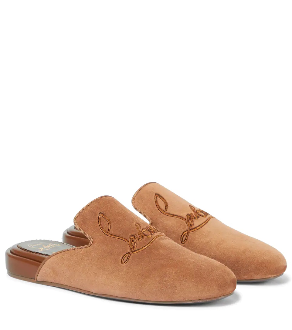 The Navy Coolito Donna slippers from Christian Louboutin's exclusive Nudes range are a lounge staple. This brown pair is made from soft suede with lambskin linings and logo-embroidered vamps. Product Details - Lining: leather - exclusive to mytheresa.com - Toe shape: round toe - Upper: lamb leather, calf leather - Sole: leather insole, signature red leather sole - Made in Italy - Item number: P00606988 Size & Fit - Fits slightly large to size - we recommend trying a half size smaller - European sizes - 3cm-1" wedge heel (size EU 38)