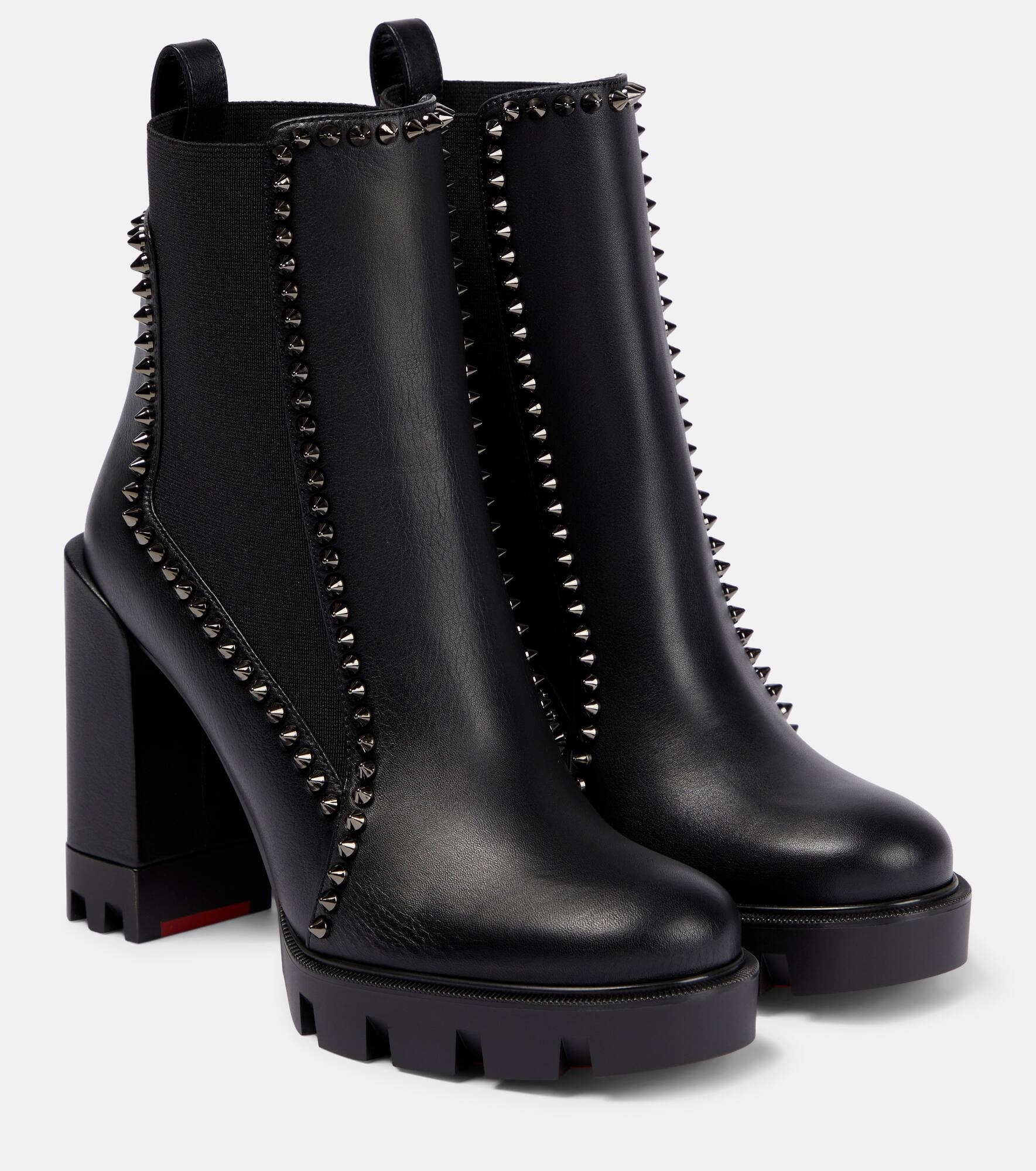 Made from leather and lined with pointed metal studs, Christian Louboutin's leather Out Line ankle boots have lugged rubber soles and high block heels. Product Details - Lining: leather - Sole: leather insole, rubber sole - Toe shape: round toe - Comes with a box - Made in Italy - Designer color name: Black - Trim: platinum-plated studs - Upper: leather - Comes with dust bags - Closure: elasticated sides - Item number: P00728032 Size & Fit - True to size - European sizes - 10cm-4" heel (size EU 38) - 2,5cm-1" platform (size EU 38)