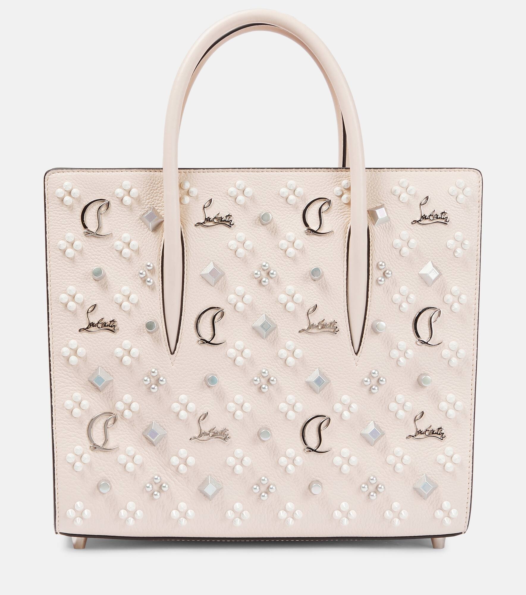 Carry all of your essentials with Christian Louboutin’s classic Paloma Medium tote bag. Made from grained calf leather, the design has a lipstick-red interior, Loubinthesky spikes, and a detachable shoulder strap for added versatility. Product Details - Internal details: internal zipped pocket, leather lining - Protective feet - Made in Italy - Designer color name: Leche/Multi - Comes with dust bag - Color of fastening: anthracite - Closure: zipped top - Detachable, adjustable shoulder strap, Top handles - Material: leather - Item number: P00753279 Size & Fit - Height 26cm-10" - Width 30cm-12" - Depth 14cm-5.5" - Length of handles 36cm-14" - Min. length shoulder strap 100cm-39.5" - Max. length shoulder strap 117cm-46"