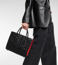 A signature house style, Christian Louboutin's Paloma tote bag is reintroduced in a capacious new silhouette. Made in Italy, the calf leather design has logo embellishments, lipstick-red lining, and tubular handles. Product Details - Internal details: internal zipped pocket, leather lining - Color of strap: black - Protective feet - Made in Italy - Designer color name: Black/Ultrablack - Comes with dust bag - Color of fastening: anthracite - Closure: zipped top - Detachable, adjustable shoulder strap, Top handles - Material: leather - Item number: P00713209 Size & Fit - Height 26cm-10" - Width 30cm-12" - Depth 14cm-5.5" - Length of handles 36cm-14" - Min. length shoulder strap 100cm-39.5" - Max. length shoulder strap 117cm-46"