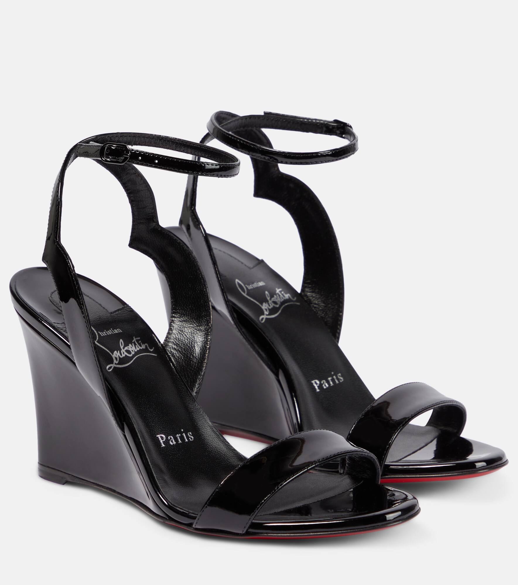 Made of patent calfskin, these wedge sandals are detailed with cutout vamps, slim straps, and buckled ankles. Finished with Christian Louboutin's iconic red soles, this pair makes every step you take a sophisticated one. Product Details - Toe shape: round open toe - Sole: leather insole and sole - Upper: leather - Comes with dust bags - Designer color name: Black/Lin Black - Closure: buckle-fastening ankle strap - Comes with a box - Made in Italy - Item number: P00813988 Size & Fit - True to size - European sizes - 10cm-4" wedge heel (size EU 38)