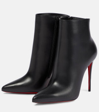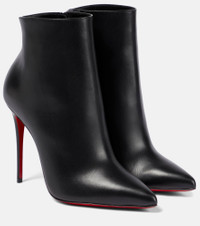 Invest in a wardrobe classic as Christian Louboutin crafts its striking So Kate ankle boots from polished black leather. This pointed-toe silhouette has been made in Italy from buttery calf leather and comes set on a steep 100mm stiletto heel. The label's signature red lacquered soles appear in high contrast to the timeless colorway. Let yours elevate wide-leg pants and floating dresses alike as you return to this style again and again. Product Details - Lining: leather - Closure: zipped side - Sole: leather insole and sole - Upper: calf leather - Toe shape: pointed toe - Designer color name: Black - Comes with a box, Comes with dust bags - Made in Italy - Item number: P00360725 Size & Fit - True to size - Narrow at the toe - European sizes - 10cm-4" heel (size EU 38)
