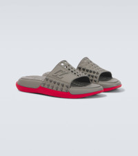 The Take It Easy slides are a warm-weather essential that offer effortless style and maximized comfort. With wide perforated upper straps and tonal spike detailing, they are completed with Christian Louboutin's signature red soles. Product Details - Upper: rubber - Lining: rubber - Sole: rubber insole and sole - Toe shape: almond open toe - Made in Italy - Includes: shoe box, dust bags - Designer color name: Smoke Grey - Item number: P01008373 Size & Fit - True to size - Half sizes please take the next size up - European sizes