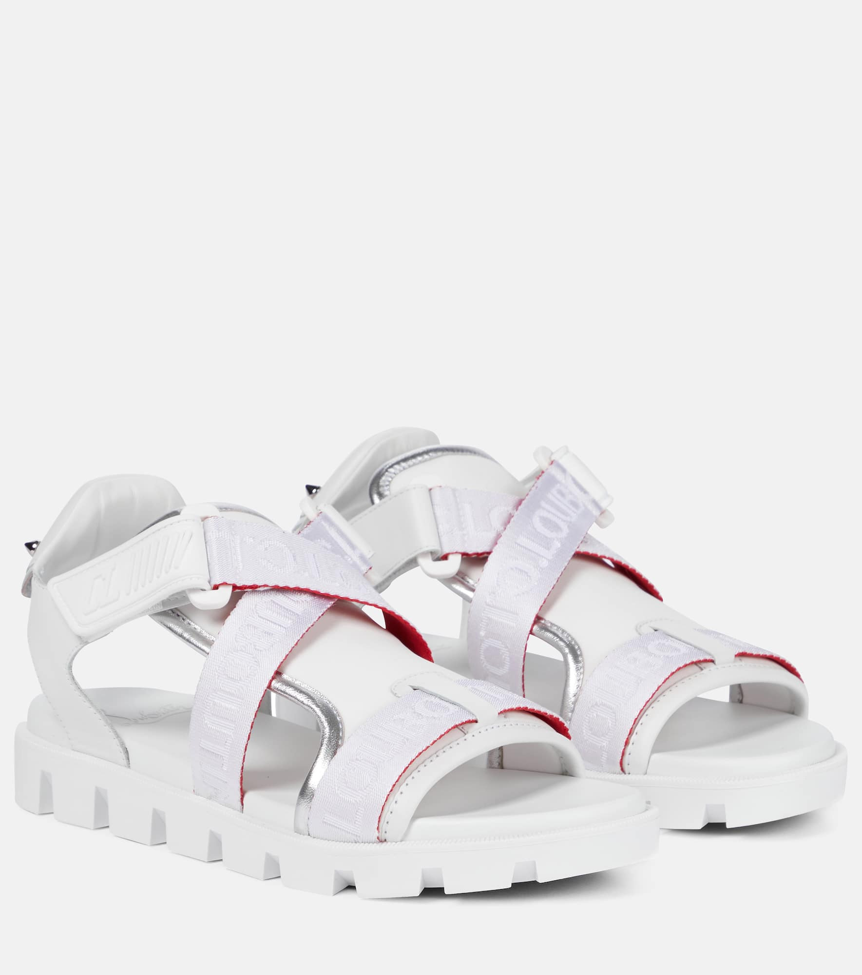 Elevate summer looks with these white Velcrissimo sandals from Christian Louboutin. Made in Italy with smooth leather trims, they have adjustable logo-jacquard straps and chunky rubber tread soles. Product Details - Toe shape: round open toe - Sole: leather insole, rubber sole - Upper: fabric - Trim: calf leather - Closure: VELCRO® fastening - Lining: fabric - Made in Italy - Item number: P00579233 Size & Fit - Fits slightly small to size - we recommend trying a half size larger - European sizes - 2,5cm-1" platform (size EU 38) - 3,5cm-1.5" wedge heel (size EU 38)