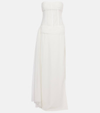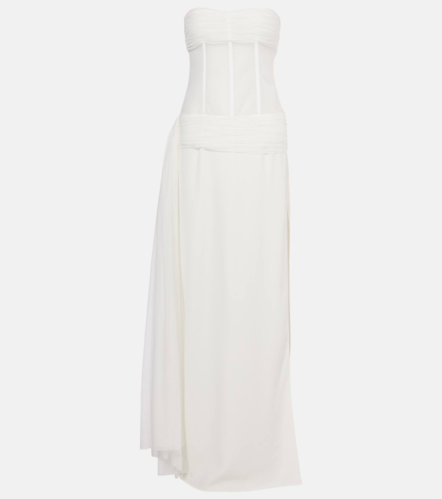 Product Details - Material: 100% polyester - Care instructions: dry clean - Made in China - Designer color name: White - Item color: white - Material II: 97% viscose, 3% elastane - Material III: 100% silk - Closure: invisible zipper - Item number: P01034058 Size & Fit - Fits small to size - we recommend trying one size larger - Strapless - Internal boned corset for support - Semi-sheer - Cinched waist - Non-stretchy fabric - slit length 81,0cm-32" - The model seen in the picture is 178cm-5'10" and wearing a size UK 8