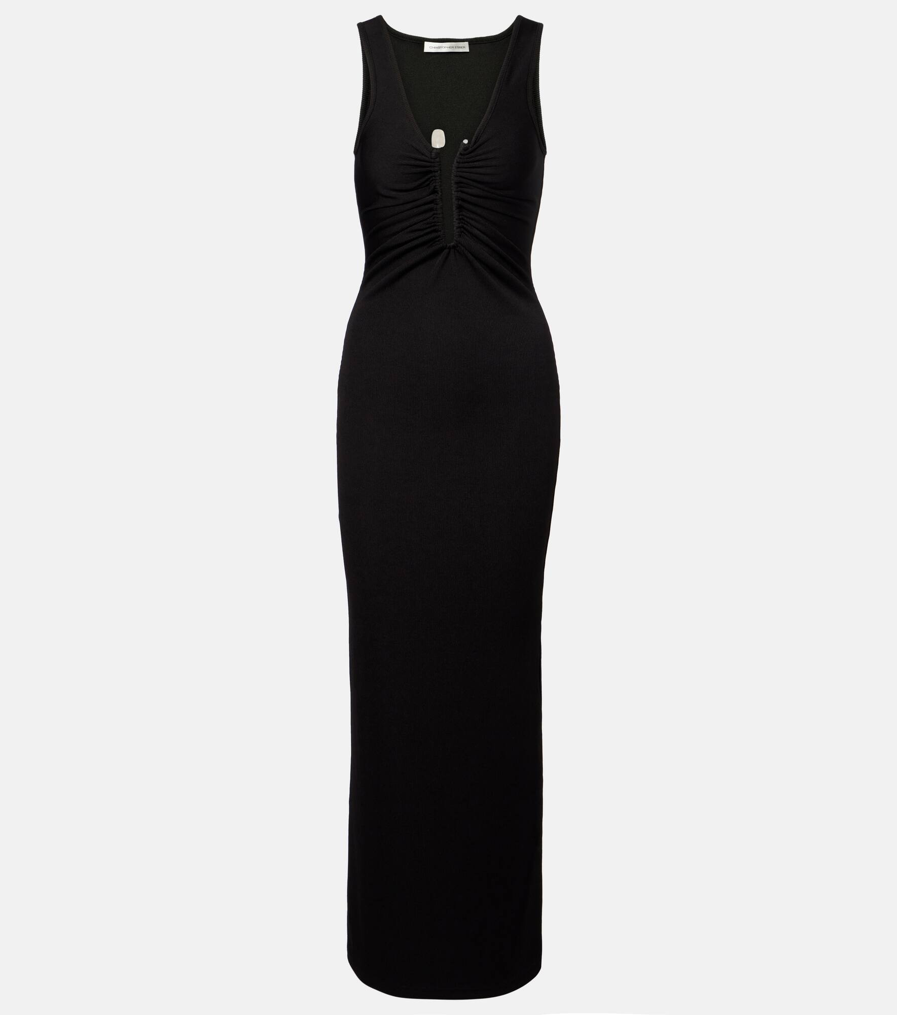 Christopher Esber’s sensual cuts and sculptural hardware bring a modern edge to minimalist design. Crafted from ribbed jersey, the Crystal Pin maxi dress features a V-neckline with the signature stone embellishment, ruched detailing, and a side slit. Product Details - Material: 96% polyester, 4% elastane - Care instructions: dry clean - Made in Vietnam - Designer color name: Black - Item color: black - Details: 50% copper, 50% natural stone - Item number: P01048185 Size & Fit - True to size - Fitted - Stretchy fabric - slit length 51,0cm-20" - The model seen in the picture is 178cm-5'10" and wearing a size UK 6