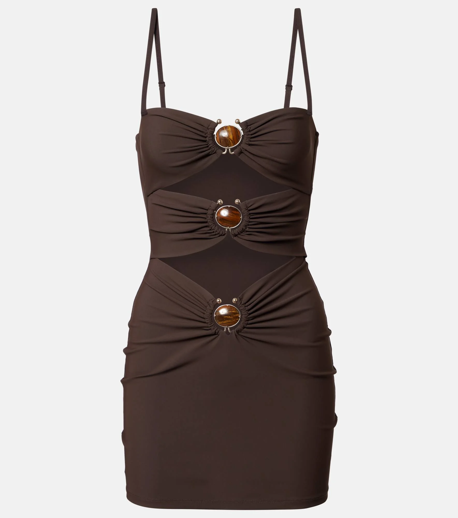 Christopher Esber's sensual cuts and sculptural hardware make for a contemporary twist on minimalism. This minidress features three front cutouts complete with ring details and brown-hued mineral stones. Product Details - Material: 72% polyamide, 28% elastane - Care instructions: hand wash - Made in China - Designer color name: Umber - Item color: brown - Details: 50% brass, 50% natural stone - Adjustable shoulder straps - Item number: P01107199 Size & Fit - True to size - Fitted - Stretchy fabric - The model seen in the picture is 178cm-5'10" and wearing a size UK 6