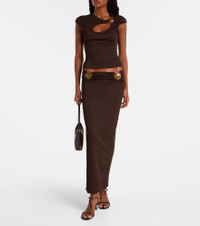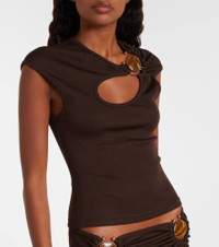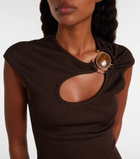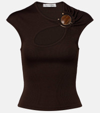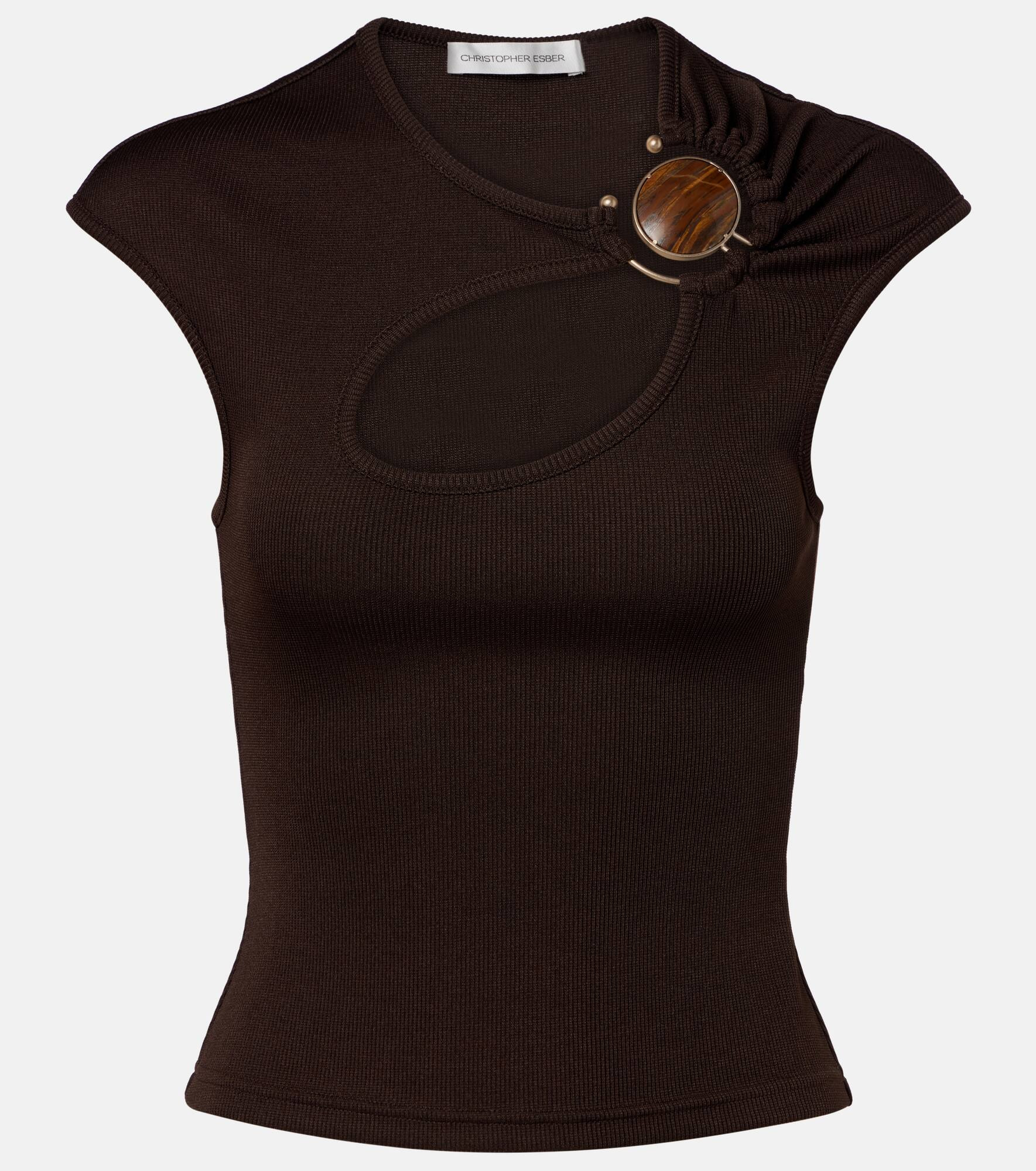 Christopher Esber's sensual cuts and sculptural hardware make for a contemporary twist on minimalism. Made from ribbed, stretchy fabric, this form-fitting top comes with a cutout on the front and a brass and stone embellishment that creates slight gathering on the shoulder. Product Details - Material: 96% polyester, 4% elastane - Care instructions: dry clean - Made in Vietnam - Designer color name: Espresso - Item color: brown - Details: 50% brass, 50% natural stone - Hardware color: gold - Item number: P01074726 Size & Fit - True to size - Fitted - Stretchy fabric - Slightly cropped - The model seen in the picture is 178cm-5'10" and wearing a size UK 6
