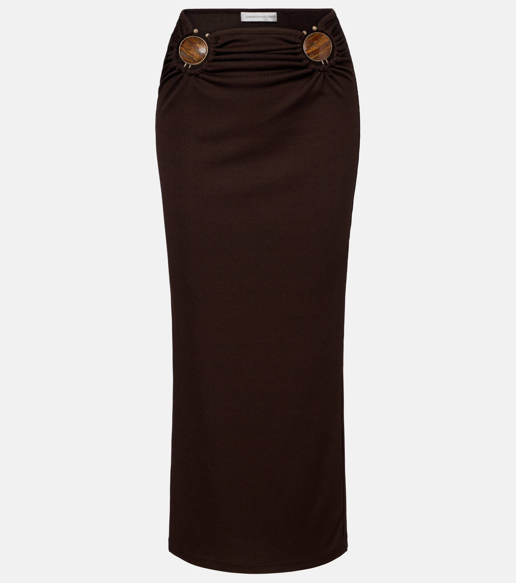 Christopher Esber's sensual cuts and sculptural hardware make for a contemporary twist on minimalism. Made from ribbed, stretchy fabric, this form-fitting maxi skirt comes with brass and stone embellishments that create slight gathering at the waist. Product Details - Material: 96% polyester, 4% elastane - Care instructions: dry clean - Made in Vietnam - Designer color name: Espresso - Item color: brown - Details: 50% brass, 50% natural stone - Elasticated waistband - Item number: P01074727 Size & Fit - True to size - Stretchy fabric - The model seen in the picture is 178cm-5'10" and wearing a size UK 6