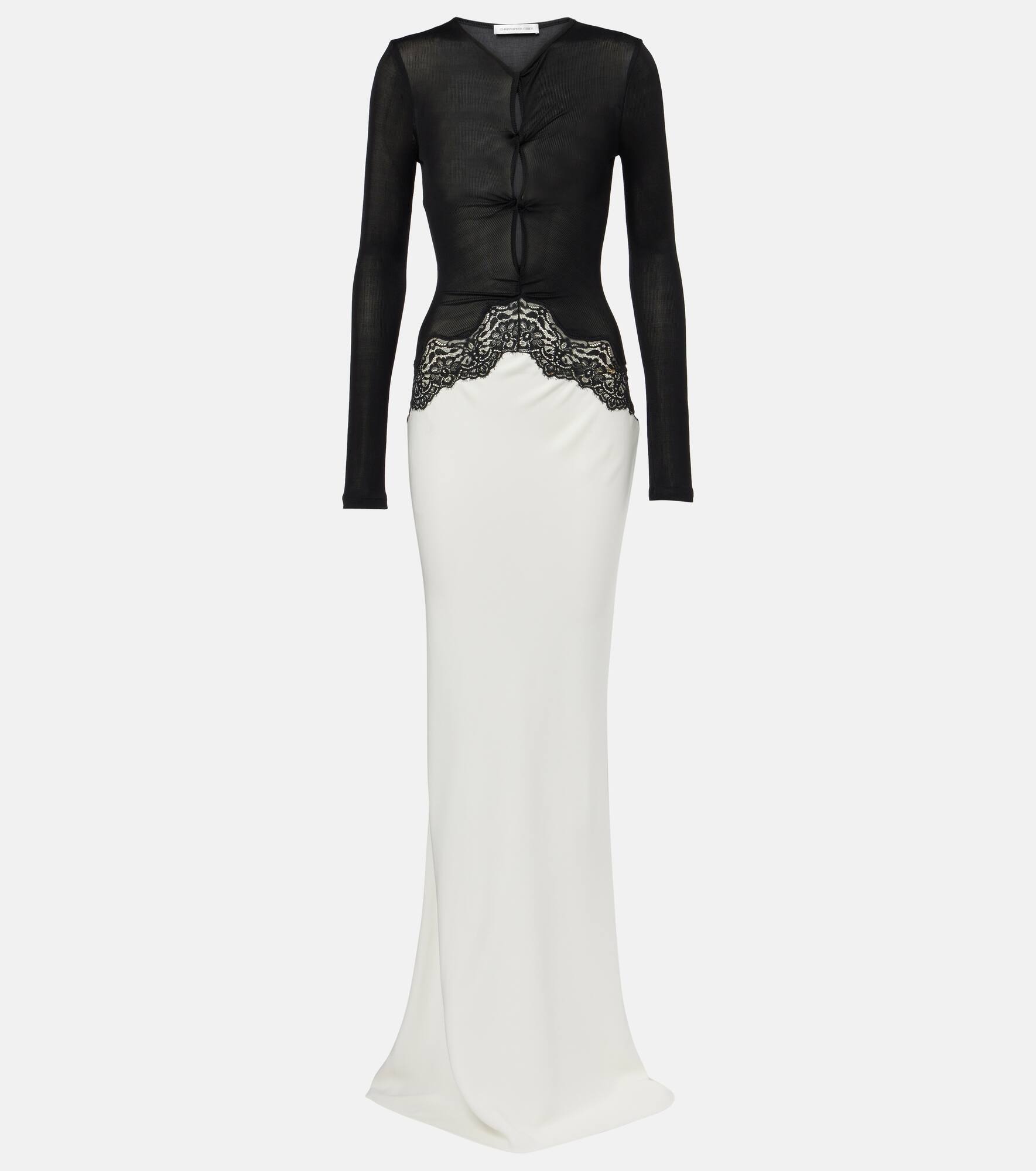 Cutout twist-front lace-trimmed ribbed-knit and crepe gown White