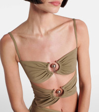 The Orbit maxi dress from Christopher Esber features orb hardware used as hooks, creating a ruched effect. The design is finished with the brand's signature cut-out details. Product Details - Material: 72% polyamide, 28% elastane - Care instructions: hand wash - Made in China - Designer color name: Eucalypt - Item color: green - Item number: P01034633 Size & Fit - True to size - Fitted - Stretchy fabric - The model seen in the picture is 178cm-5'10" and wearing a size UK 6