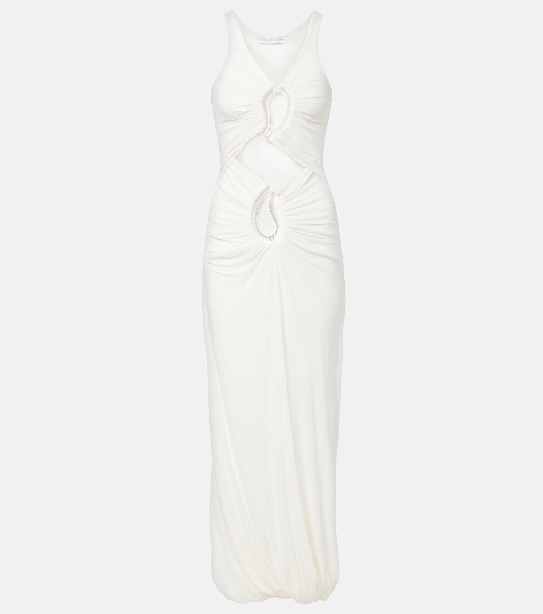 Crafted from fluid jersey, the Paisley Disconnect maxi dress by Christopher Esber showcases striking cutouts, each framed by the brand’s signature metal paisley hardware. This sculptural design is finished with directional gathers that enhance movement. Product Details - Material: 71% rayon, 29% polyester - Care instructions: dry clean - Made in Vietnam - Designer color name: White - Item color: white - Material II: 96% polyester, 4% elastane - Hardware color: brass - Item number: P01048148 Size & Fit - True to size - Cinched waist - Stretchy fabric - The model seen in the picture is 178cm-5'10" and wearing a size UK 6