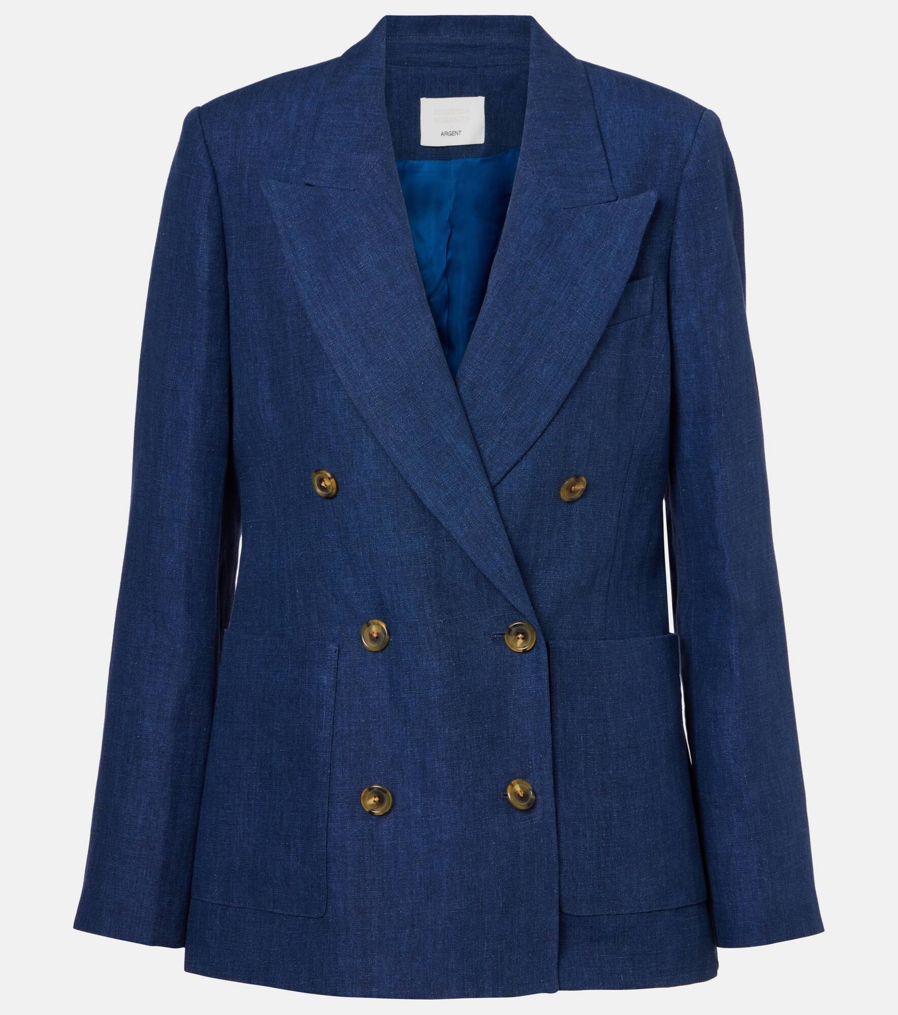 Made from pure linen, this double-breasted denim blazer from Citizens of Humanity will become one of your favorite wardrobe pieces. Its padded shoulders create an elegant structure, and the buttons add a color contrast. Product Details - Material: 100% linen - Care instructions: dry clean - Made in Portugal - Designer color name: Blue Linen - Item color: blue - Lining: 100% cupro - Pockets: patch pockets, internal pockets - Peak lapel - Closure: double-breasted buttoned front - Vent: single - Item number: P01054944 Size & Fit - True to size - Shoulder pad inserts - Cinched waist - Non-stretchy fabric - Falls below the hip - The model seen in the picture is 178cm-5'10" and wearing a size US 4