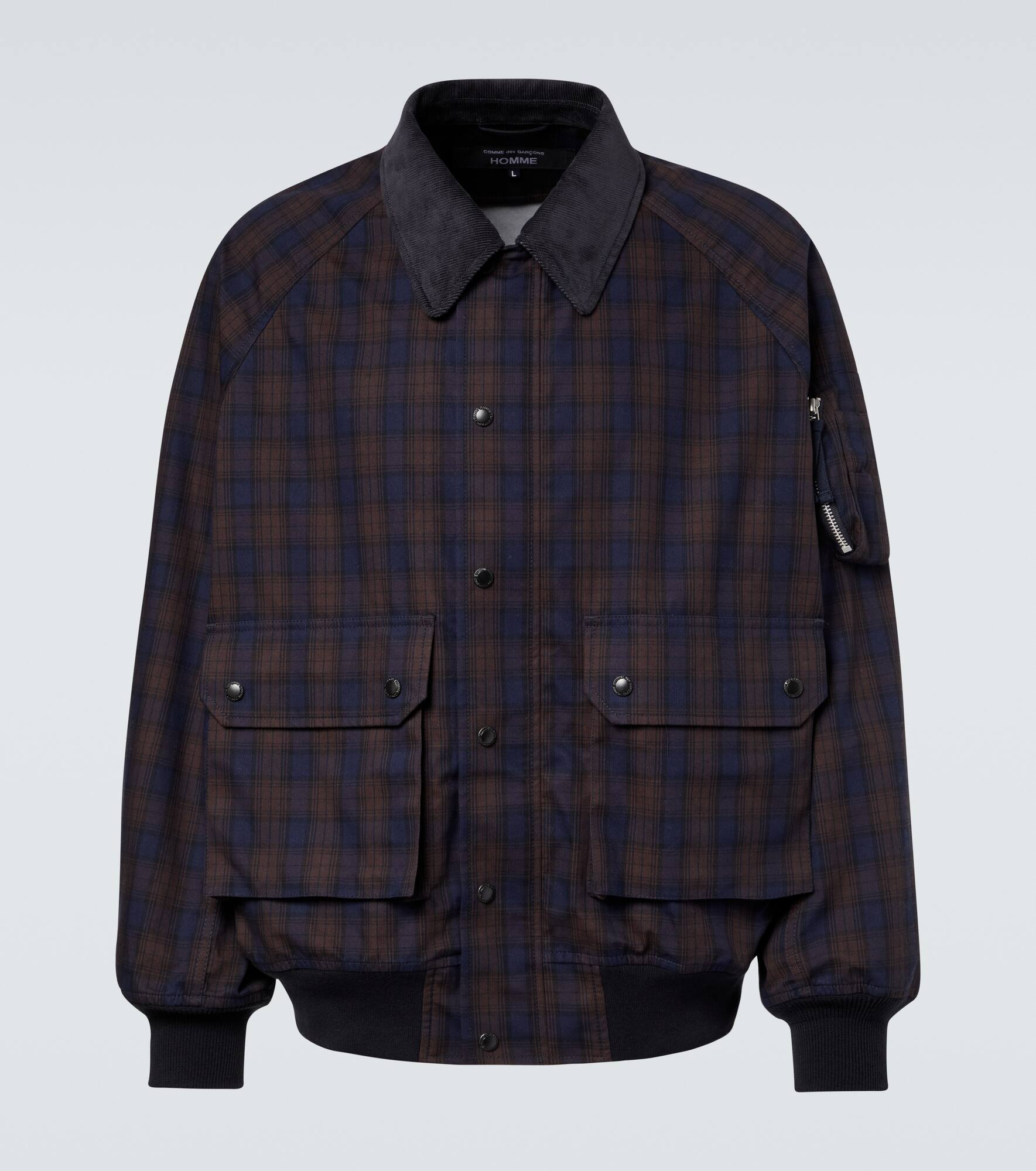 Comme des Garcons Homme is celebrated for its deconstructed take on menswear essentials. Crafted from soft cotton, this blouson features a checked pattern, a classic point collar, utilitarian flap pockets, and a zip-and-snap closure. Product Details - Material: 100% cotton - Care instructions: hand wash - Made in Japan - Designer color name: Navy - Item color: blue, brown - Lining: 100% nylon - Trim: 50% cotton, 50% polyester - Material II: 85% cotton, 15% polyester - Hardware color: silver - Closure: zipper, snap-button fastenings - Collar: classic (Straight point) - Pockets: flap pockets, sleeve pocket - Cuff: ribbed - Hem: ribbed - Item number: P01098184 Size & Fit - True to size - Designed for a loose fit - Elasticated hem - Non-stretchy fabric - Falls to the hip - The model in the picture is 185cm-6'1" and wearing a size L