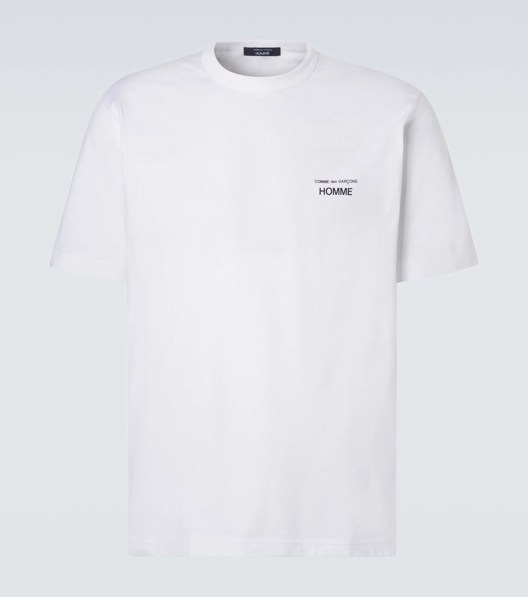 Comme des Garcons Homme is celebrated for its deconstructed take on menswear essentials. This T-shirt is crafted from soft cotton jersey with the brand's logo at the chest. Product Details - Material: 100% cotton - Care instructions: hand wash warm - Made in Japan - Color: white - Designer color name: White - Item number: P01164523 Size & Fit - True to size - Straight fit - Slightly stretchy fabric - Falls to the hip - The model in the picture is 185cm-6'1" and wearing a size L