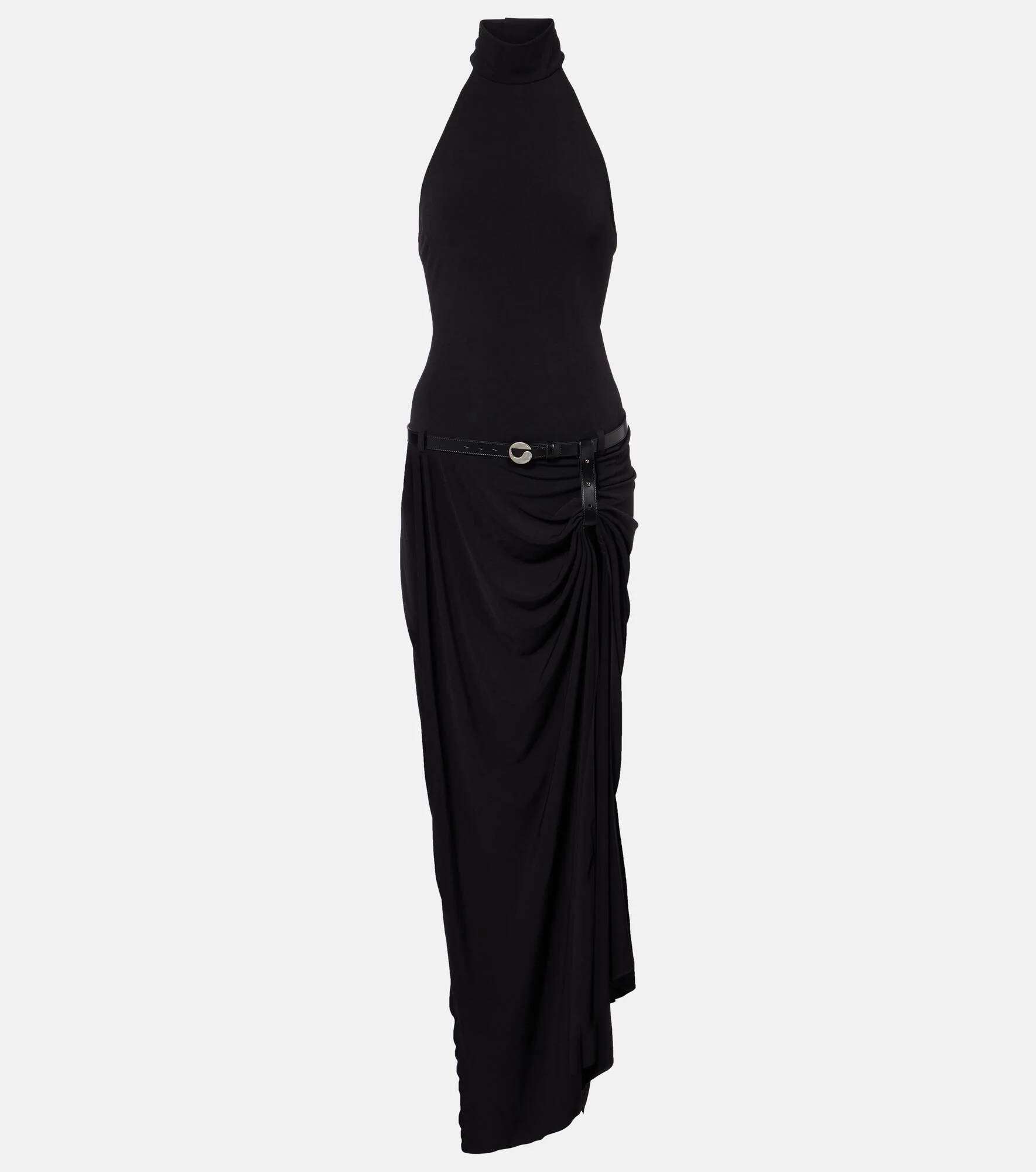 Coperni takes its name after the astronomer Nicolaus Copernicus, whose precise work inspires the brand’s deeply detailed designs. This maxi dress is tailored to an asymmetric silhouette with a halter neckline, refined draping, and a detachable belt with the signature buckle. Product Details - Material: 95% polyester, 5% elastane - Care instructions: machine wash at 30 degrees - Made in France - Designer color name: Black - Item color: black - Hardware color: silver - Closure: buttoned back - Long vent - Detachable belt - Item number: P01100759 Size & Fit - True to size - Low back - Fitted - Adjustable at the waist - Stretchy fabric - The model seen in the picture is 178cm-5'10" and wearing a size FR 36